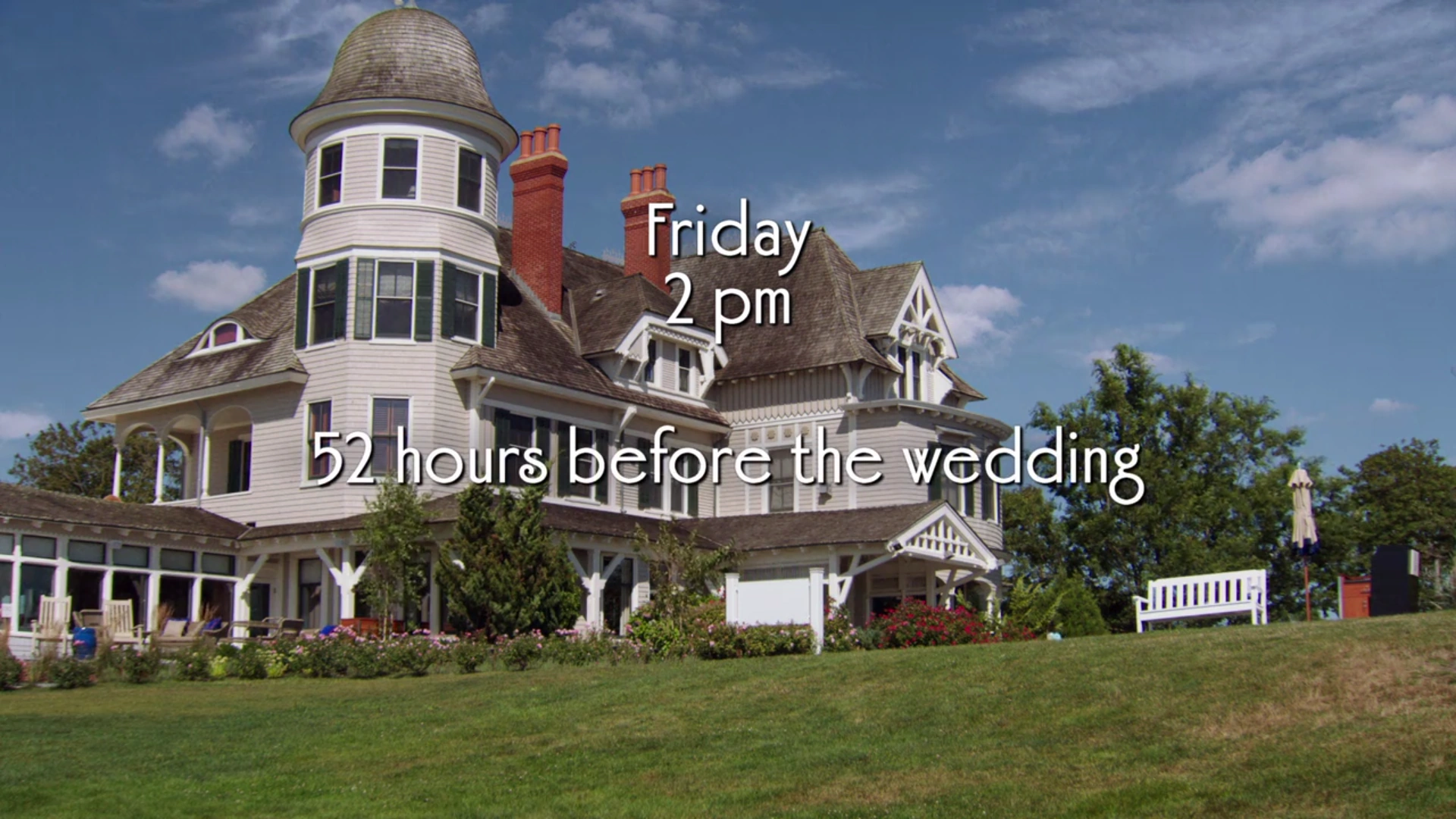 Freitag, 14 Uhr (52 Stunden bis zur Hochzeit). Robin und Barney gehen die Hochzeit miteinander durch, als sie feststellen, dass ihre Verwandten bald ankommen. Sie wollen noch einmal miteinander schlafen, als ihnen bewusst wird, dass sie keinen einzigen Moment mehr miteinander haben werden. Derweil erkundigt sich Lily bei Marshall, wie seine Reise nach New York verläuft. Er hofft, dass er rechtzeitig zur Hochzeitsprobe ankommt und Lily erinnert sich daran, welches Kleid, das von der Reinigung zerstört wurde, sie eigentlich tragen wollte. Als Ted zu ihr kommt, entdeckt Lily eine Liste, die Ted gemacht hat. Darauf sind viele Dinge notiert, die er unbedingt vor seiner Abreise nach Chicago in New York machen will. Lily ist wütend, dass sie die einzige ist, die über seinen Umzug Bescheid weiß und möchte, dass er Barney und Robin nicht länger aus dem Weg geht.