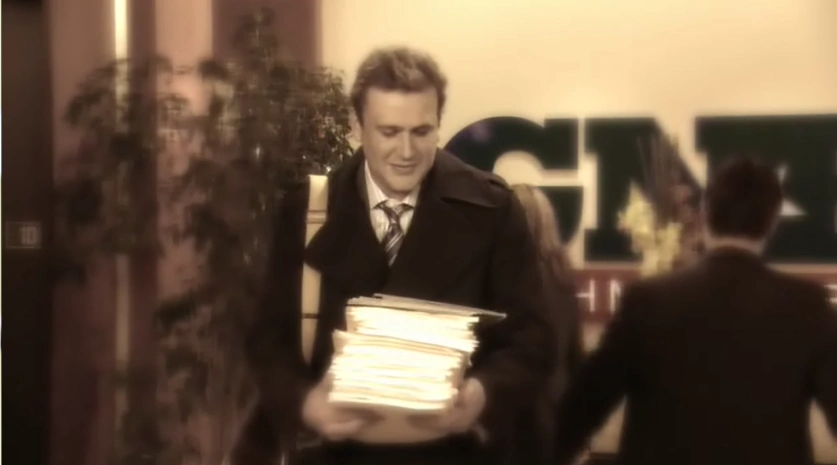 Marshall, als er bei der GNB kündigen will und die "rosa Rückblick Brille" auf hat.