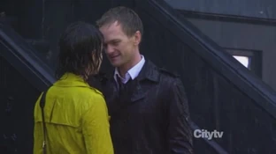 - Disaster Averted - Ted tells the story of the "no boogie boarding" sign outside the bar. During the torrential rain, Barney says to Robin, "when I let a day go by without talking to you… um… then that day’s just no good." After the gang plays in the rain, Barney and Robin reminisce in a cab together about the time they almost made out with each other, and start making out.